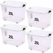 Premify Storage Box 25 L With Lockable Lid & Wheels Clear Plastic Organizer â 4pcs Transparent Boxes Storing Clothes, Toys, Tools, Medicine, Office Supplies