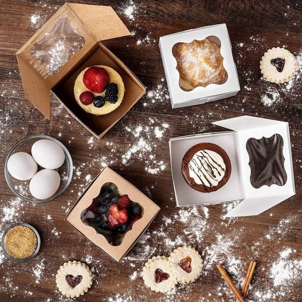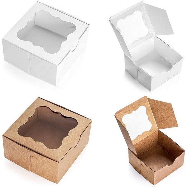 PACK OF 20 White and Brown Bakery boxes with clear window,(4x4x2.5inch) SQUARE Small Kraft PAPER GIFT Pie Cookie BAKERS Cake Box with Natural Disposable Storage
