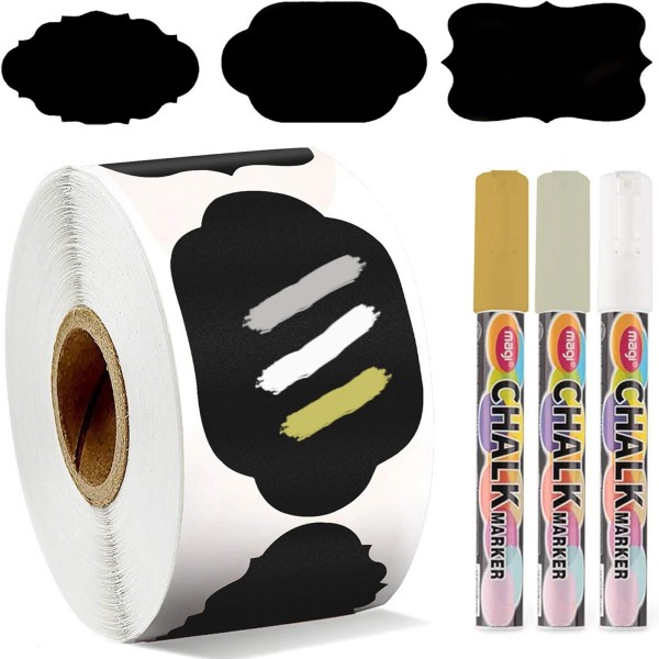- ✓ Black Matt vinyl Chalk 300 labels (50mmX28mm size) in 3 styles with Premium 3 Chalk markers in White Gold & Silver colors.