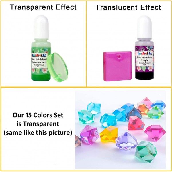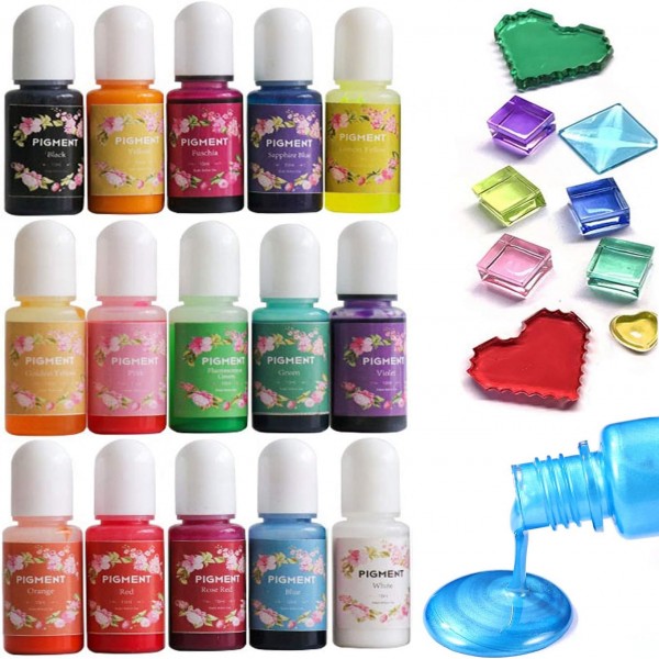 - COLOR COLLECTION - 15 colours epoxy resin pigments are perfect choice for epoxy resin art projects colouring, color range is BLACK, WHITE, BLUE, GREEN, YELLOW, RED, FLOURESCENT GREEN, ORANGE, SAPPHIRE BLUE, ROSE RED, PINK, LEMON YELLOW, GOLDEN YELLOW, VIOLET and FUSCHIA, which can make your creations brilliant while staying crystal clear(except black and white color dye). Feel free to blend them to achieve the colour you want.