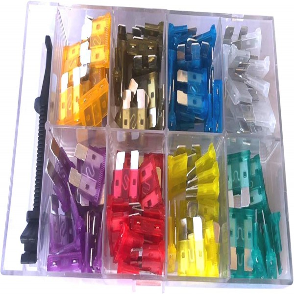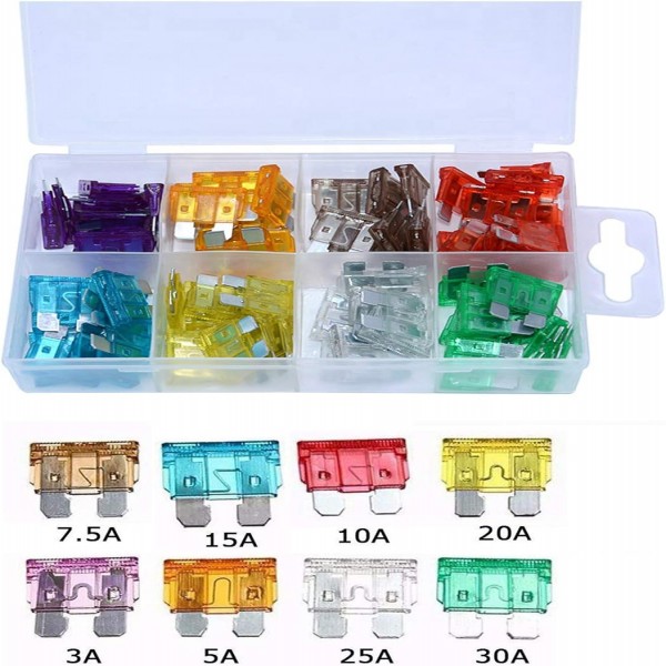 - 【Package Includes!!!】- Total 100pcs, including 3A(Purple), 5A(Orange), 7.5A(Black), 10A(Red), 15A(Blue), 20A(Yellow), 25A(White), 30A(Green) blade fuses, well meets your emergent needs for various electrical devices.