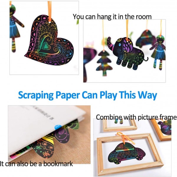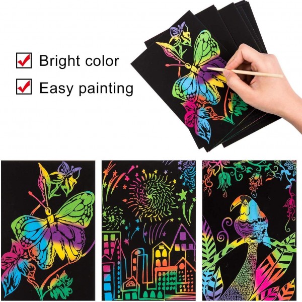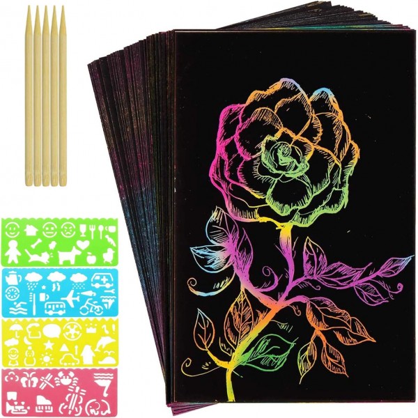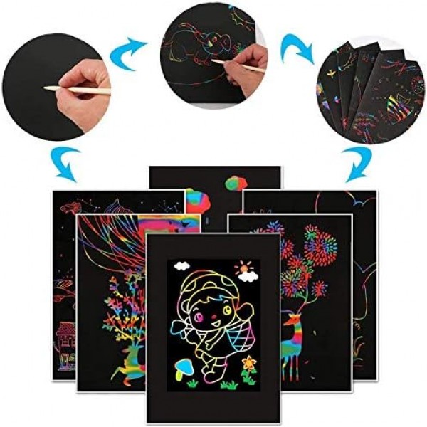 • ✍️RAINBOW SCRATCH ART -- Scratch Art products feature bright colors and patterns hidden beneath a matte coating, plus a wooden stylus to reveal them with just a simple scratch. Package including: 50 Sheets Black Scratch Art Paper + 5 Wooden Stylus + 4 Drawing molds