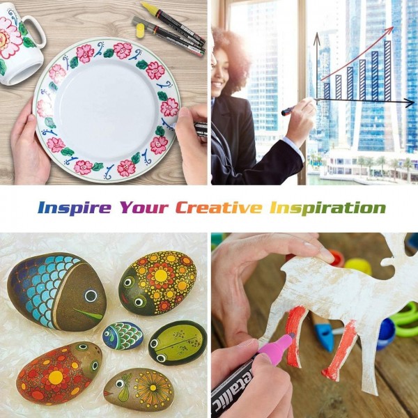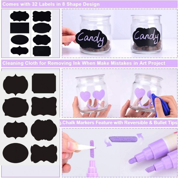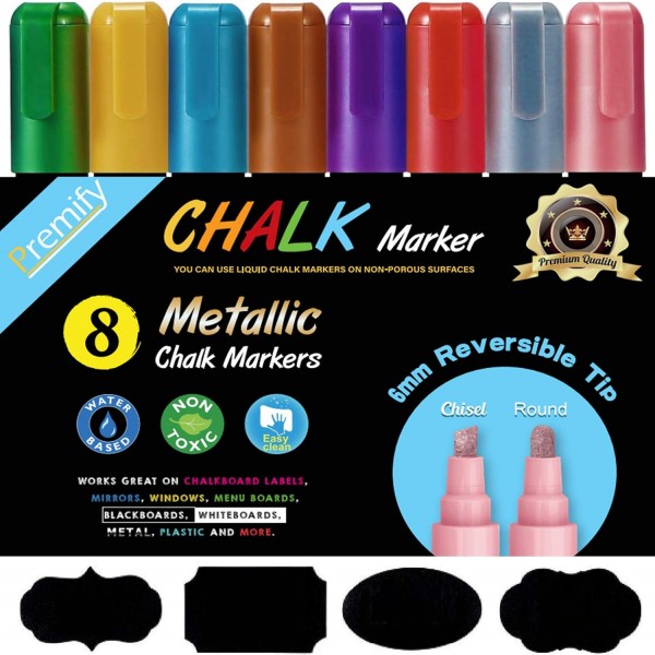 • 【METALLIC CHALK MARKERS】 Comes in 8 metallic colors (Gold, Sliver, Blue, Green, Red, Pink, Purple, yellow)They are gloriously vibrant and work perfectly on many NON-POROUS surfaces. NOTICE: SOME CHALKBOARDS MAY NOT BE SUITABLE FOR THE USE OF CHALK MARKERS, KINDLY TRY THEM ON SMALL AREAR BEFORE USE
