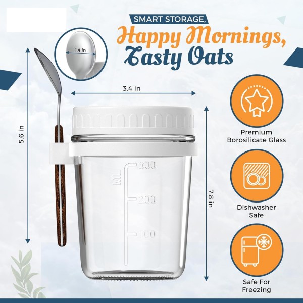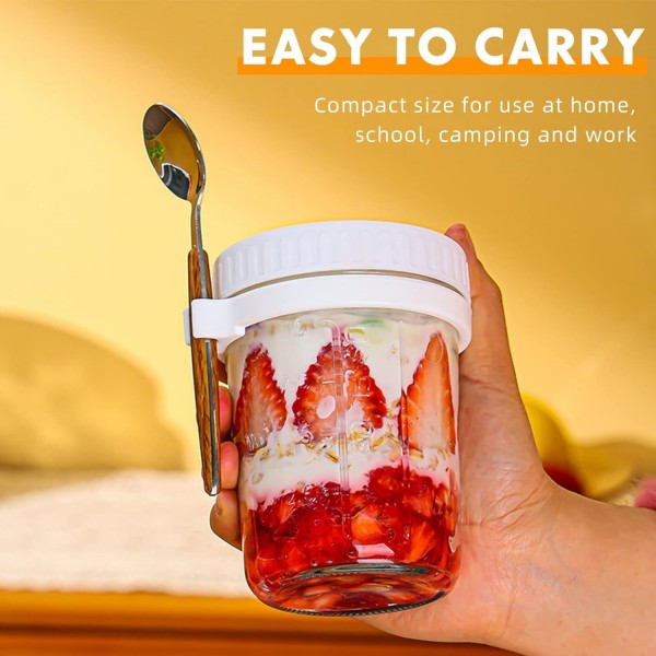 - [With Spoon Design] These overnight oats jars are equipped with spoons which have a slender handle and moderately sized spoon head for more easily scooping out the food. And the overnight oats jars feature a full ring clip that provides a way of storing the spoon firmly. Spoons will not be easy to fall off. Enable an easy dining on the go.