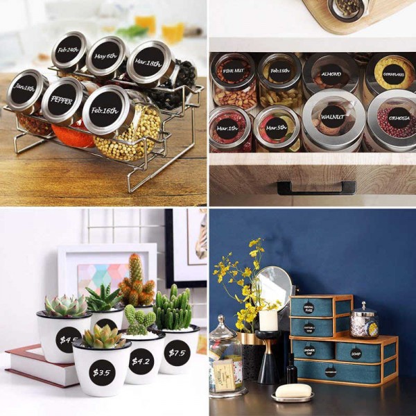 - A MULTI-PURPOSE DIY CHALKBOARD LABEL: Works great for mason jars, jelly, spice, jam, herb, candy, cookie or seasoning jars, canning jar, round bottles, wine glasses, coffee cups or tea tin boxes, canisters, wooden wicker baskets, folders, office supplies, classroom toy bins. Organizing and decorating Chalkboard Labels are a good choice for kitchen pantry storage labels. Come in big size to fit more information and symmetric design you can cut in small, mini and medium sizes for different usage