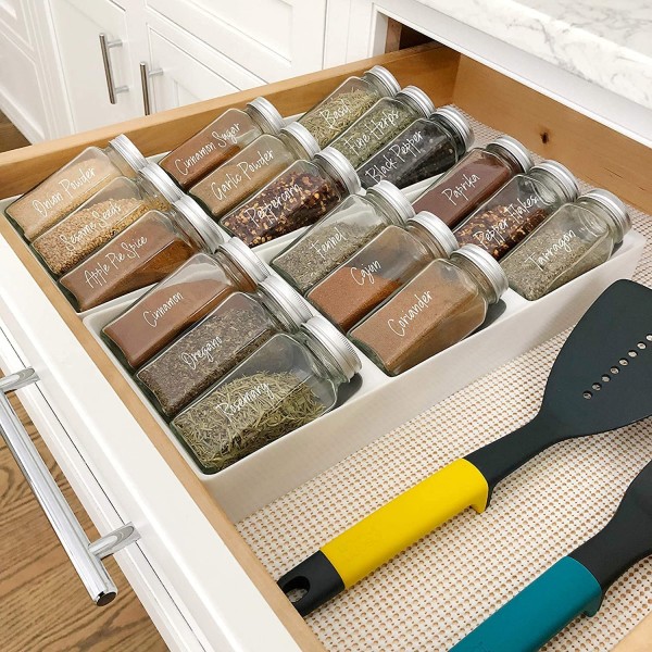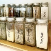 - SPICE LABELS STICKERS PREPRINTED, NO MESSY HANDWRITING: Our spice labels are printed in white and black script font with high contrast for easy reading. These are solid decals, no rubbing required. Labels are preprinted on water resistant transparent vinyl that won't peel off or tear, on premium material that can be removed and replaced if needed.