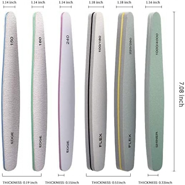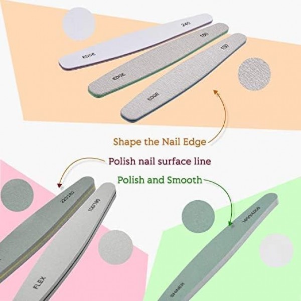 - Multi-Functions: Gel nail file set include 6 girt emery materials nail files, double-sided.150,180,240 grit emery board is good for shaping nail edge, 100/180 and 220/280 nail file fit to polish your nail surface. The difference in functionality depends on the different frosted level of surface of nail file.