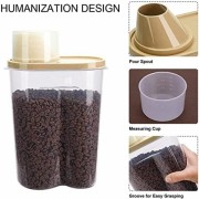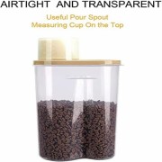 - 2pcs Set of Pet food storage containers with measuring cups and pour spout in Random colors of Lids, making every pouring neat and clean. The airtight bin design with keep food dry. Measuring cup can screw on over the pour spout.her pests away. Easy to use in Traveling. Also known as Travel food Bowl