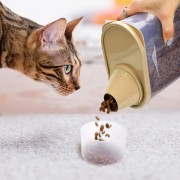 - The capacity of the container is 2.5L that can hold about 3.5 lbs dog food or cat food. Translucent design allows for easy monitoring of food levels and the measuring cup with a scale, can easily to control of your dog's appetite.