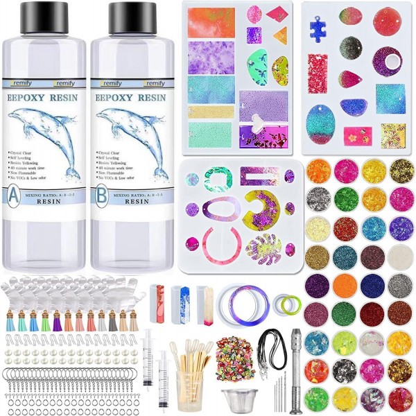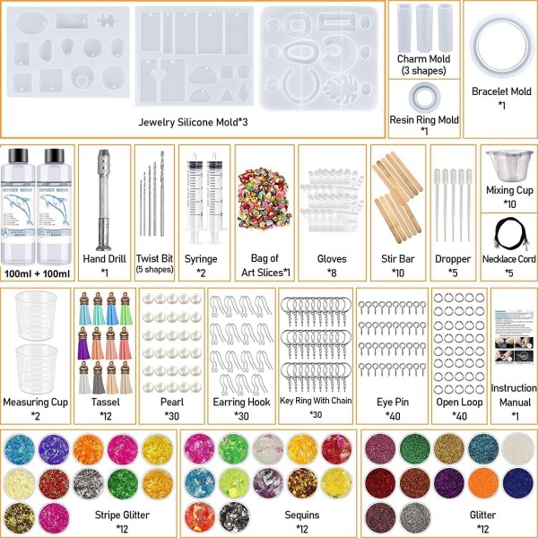 - ✨【Resin Jewellery Making Kit】Our resin kits for beginners with molds have everything you need. 100ml resin A & 100ml hardener B, 3 x resin moulds, 12 x resin Sequins, 12 x resin glitter, 12 x Stripe Glitter, 5 x Twist Bit , 30 x earring hook, 5 x Necklace cord, 10 x keyring, 40 x Eye Pin, 40 x Open Loop, 30 x Pearls, 12 x Tassel,10 x mixing cups, 2 x ( measuring cups, gloves, spoons,Droppers ), 1 x tweezer,1 x hand drill, 10 x stirring sticks, 5 x dropper and many more.