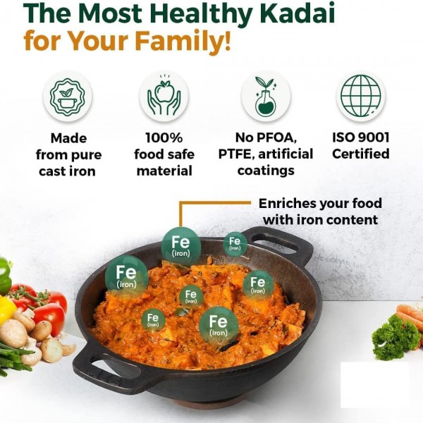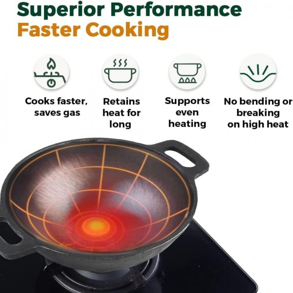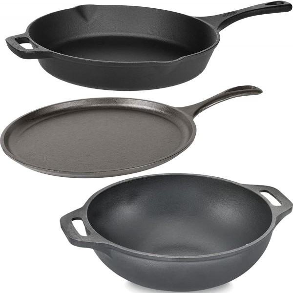 - 3 pcs Set of Cast Iron Cookware: Cast Iron 9 inch Wok Pan / Kadai with Flat Botton + 10” Skillet / Frying Pan + 10.5” Griddle / Dosa Tawa. This versatile cast iron combo which is used for Frying Stir Fry, Cooking, Steaks, Meats, Kadhai, Dossa making, Chapati/ Roti making, Burgers, Pizza, Crepe, bake bread, saute onions & peppers,
