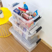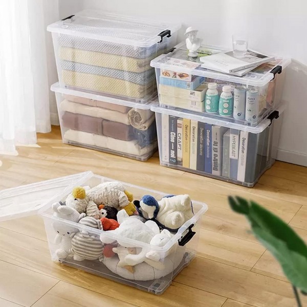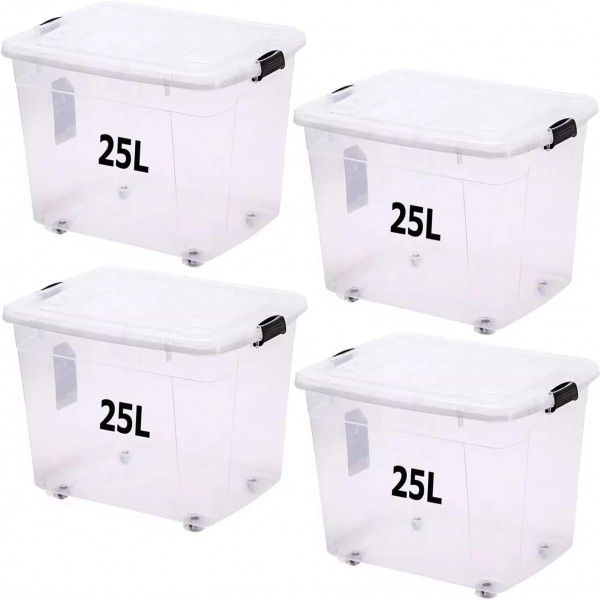 - TRANSPARENT –4Pcs 25L Storage Boxes with Lids ( box size 45cm X 32cm X 27cm), Super clear plastic material makes the body and lid clear enough to identify the elements outside from any angle.