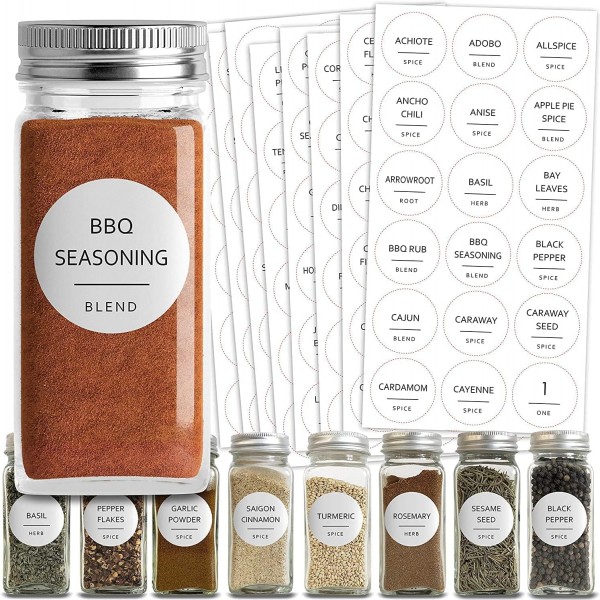 - PREPRINTED SPICE LABELS: Our spice labels are printed in all caps large black font with high contrast for easy reading. These are solid decals, no rubbing required. Labels are preprinted on water resistant white vinyl that won't peel off or tear, on premium material that can be removed and replaced if needed.