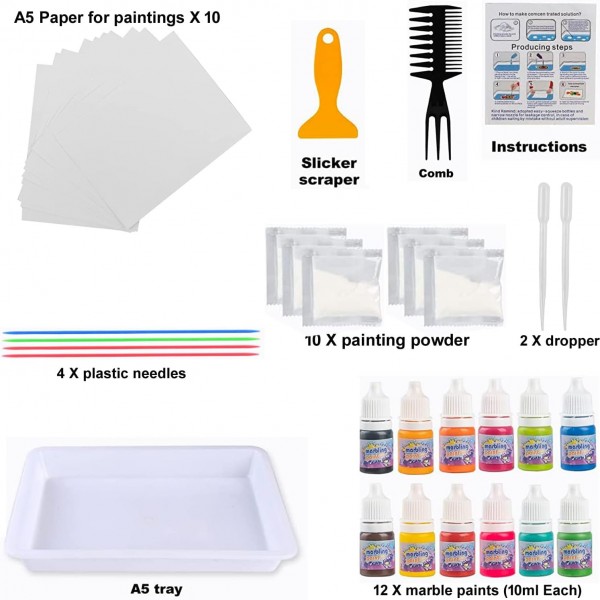 - Kit includes: A5 size Design tray, 12 paint colors, 10 packs carrageenan powder, scraper, Comb, 2 Droppers, 4 styluses, 10 art sheets. The kit offers a wide range of vibrant colors, allowing artists to explore their creativity and experiment with different combinations.
