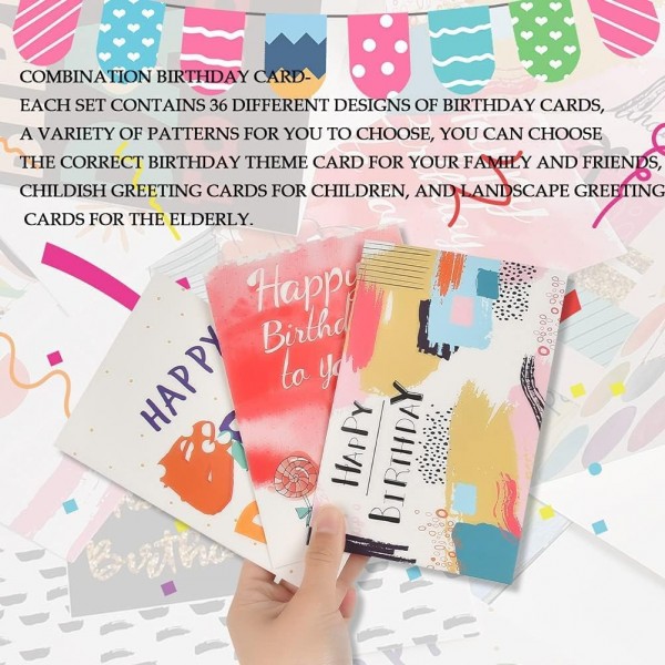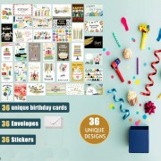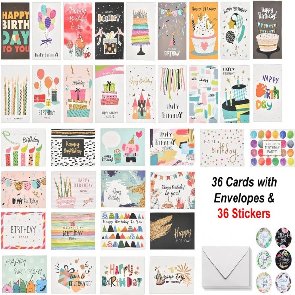 - Complete Pack: 36 Birthday cards with 36 Envelopes and 36 sealing thank you stickers, these stickers will present your card in elegant way