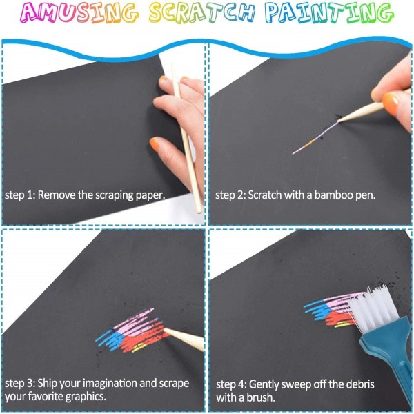 - ✍️SCRATCH PAPER EDUCATION KIDS -- Use the scratcher to scratch away the black matte surface of the paper, revealing the colorful background, so fun plus allows for amazing creative artwork, signs, and more! Makes an excellent arts and crafts activity for kids or grown-up artists! Keep kids busy with this delightful craft supply!