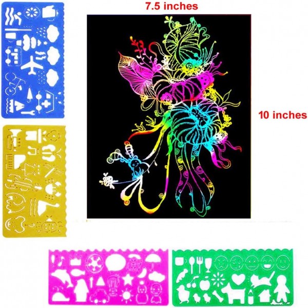- ✍️RAINBOW SCRATCH ART -- Scratch Art products feature bright colors and patterns hidden beneath a matte coating, plus a wooden stylus to reveal them with just a simple scratch. Package including: 50 Sheets Black Scratch Art Paper + 5 Wooden Stylus + 4 Drawing molds