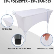 - High Quality Fabric: Our stretchable table cloth is wrinkle free, elastic, stretchy and stain resistant. It is made of 90% polyester and 10% spandex. It is very thick and more durable. The four-way elastic material and leg pockets are designed to keep the tablecloth securely in place and provide a flat, professional look so that your table cover does not slip.