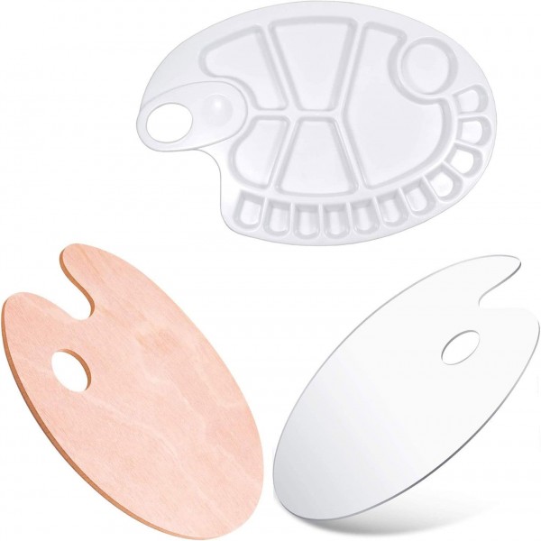 - Size of White plastic Palette: 12"X8"X0.7" (30.5cmx20cmX1.5cm) this palette have 17 wells. Size of Acrylic Palette: this oil paint palette measures approx. 20 x 30 cm/ 8 x 11.8 inch, thickness is 2.6 mm. Size of Wooden Palette: classic oval shape this painting palette size is 11.8 x 9.5 inch /30 x 24cm,the surface area on this palette permits ample space for assortment and mixing of colour.