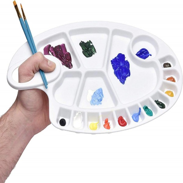 - White Plastic painters Palette: This heavy duty Oval Plastic Palette has 5 large wells and 12 small wells. It features a traditional style with thumb hole for easy handling. Made of molded white plastic, it is durable and easy to clean This set is widely used, suitable for beginners painting, student exam, teacher training and professional painting