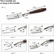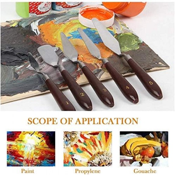 - Painting Knives - flexible Stainless steel painting blade and no sharpened edge, with sturdy wooden handle offer a long service life, light and easy to grab. Palette knife sizes range from #1-5, assorted shapes and styles for a variety of techniques. Perfect for professional artists, creative hobbyists, art students, art teachers. Great for Spreading, Scumbling, Smoothing, Smudging, Mixing, for Watercolor, Oil, Acrylic Painting / Face Painting / Miniature, Model, Craft, Rock Painting, etc.