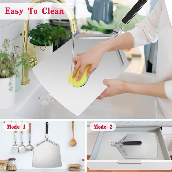 - Functional Design: 14” inches Stainless steel blades are easier to clean than aluminum and will not absorb unwanted odors or food particles. This pizza spatula for pizza stone is dishwasher safe and can be rinsed clean.