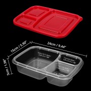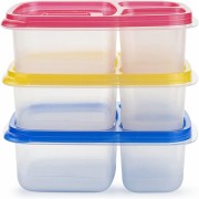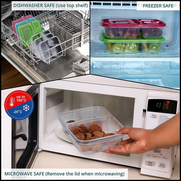 - 【3 COLOURFUL LUNCHBOXES】Included in our set are 3 bright and colourful lunch boxes. Each lunch box is L24 x W15 and H5cm (9.44 x 5.90 x 1.96 inches) and has 3 compartments that cannot be removed. Each lid is slightly transparent. Our lunchboxes are made from BPA free plastic which are non-toxic, shatterproof, airtight, retain no odour and are easy to clean. There is an easy-open tab on each box.
