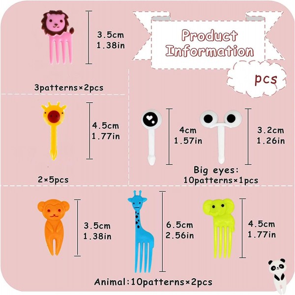 - Cute Bento Food Picks: Attractive animals designed that includes shapes of Giraffe, elephant, dog, bear, cat, lion, monkey, rabbit, panda, frog, cartoon figures eyes, musical notes. Great for lunch bento box party food, buffets or children's birthday parties.
