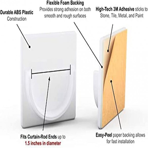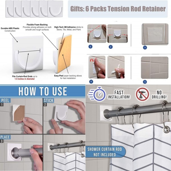 - Quality Material: The adhesive shower curtain rod holder is made of plastic which is sturdy and durable to use, high hardness, back with glue, easy to install without any tool.