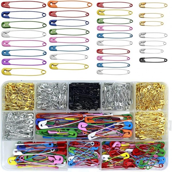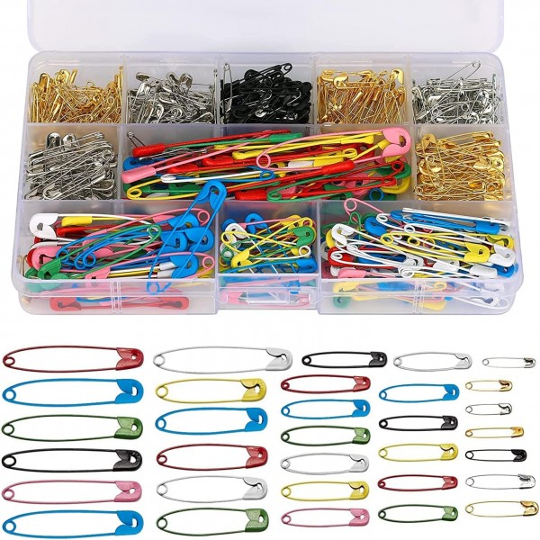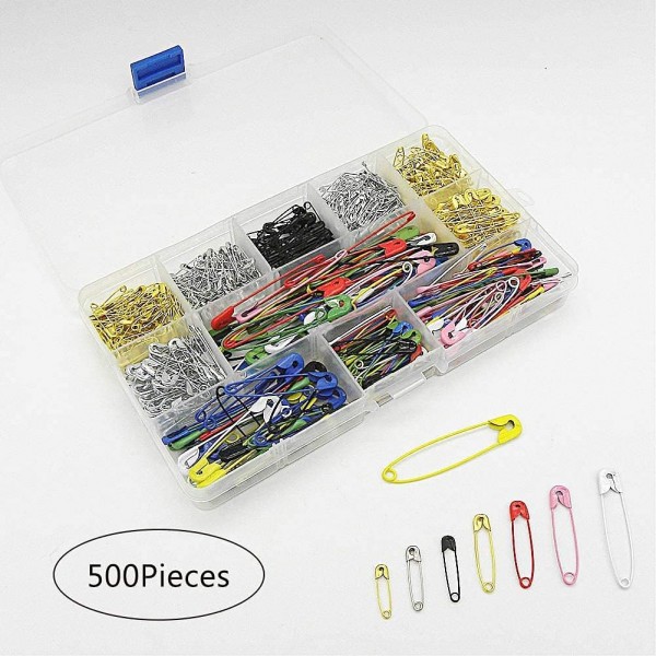 - [Size and number of safety pins]: 11 Assorted sizes for all your needs: Our upgraded box now contains 11 differently size safety pins to meet all your daily needs: 60 pcs x 19 mm silver pins, 60 pcs x 19 mm golden, 50 pcs x 22 mm silver, 50 pcs x 22 mm golden, 50 pcs x 22 mm Black, 40 pcs x 28 mm Silver, 40 pcs x 28 mm Golden, 30 pcs x 32 mm Colorful, 50 pcs x 36 mm colorful, 30 pcs x 45 mm colorful, 40 pcs x 50 mm colorful. total of 500 safety pins in pack.