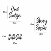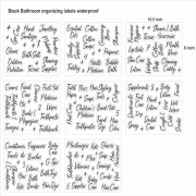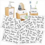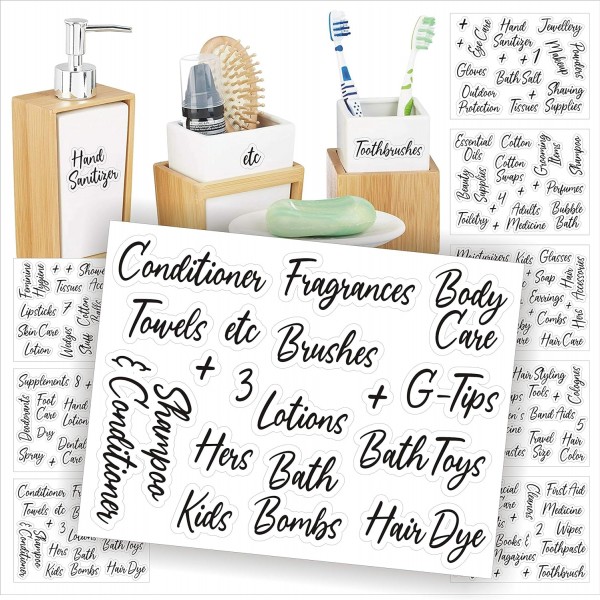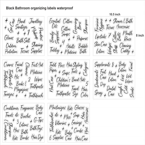 - BATHROOM ORGANIZING LABELS: 120 bathroom organizer label sets. stickers printed on high quality clear gloss vinyl material. Backing adhesive (no rubbing required). 8 sheets included size 10.5 X 8 inches. 120 common bathroom accessories names as given in pictures