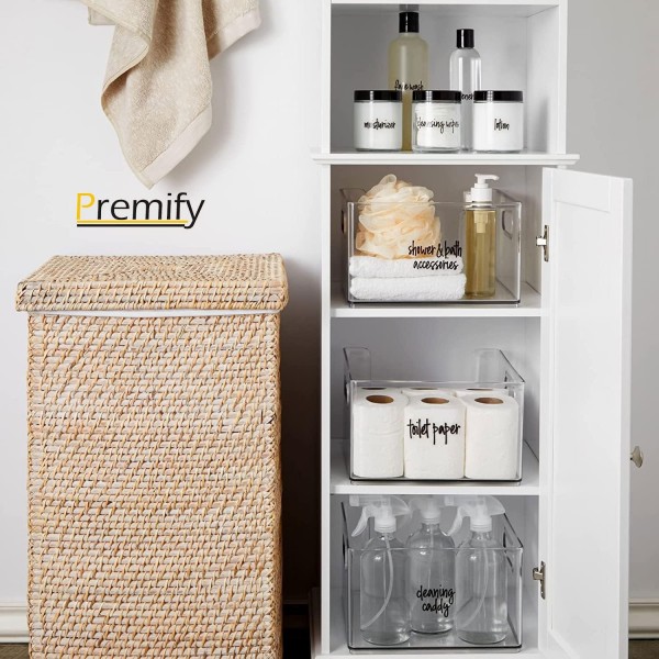 - BATH STICKERS FOR CANISTERS, JARS, BOTTLES, BOXES & BINS: 120 most common items found in most bathrooms. Different Size of the stickers depends on length of words. Professionally planned and designed by PREMIFY