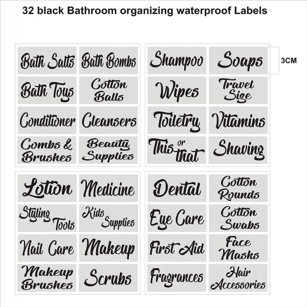 - BATHROOM ORGANIZING LABELS: 32 bathroom organizer label sets. stickers printed on high quality clear gloss vinyl material. Backing adhesive (no rubbing required). 4 sheets included size 14 x 14cm. 32 common bathroom accessories names as given in pictures