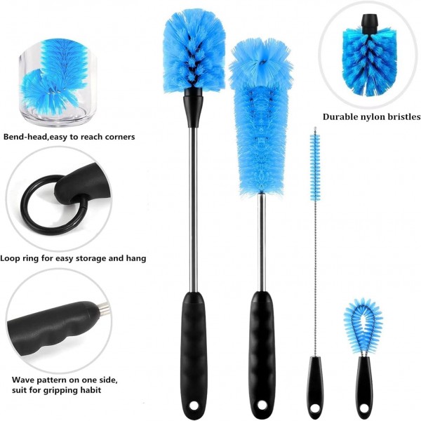 - Assortment: The bottle cleaner brush kit includes 15" long handle beer bottle brush, 14" sports water bottle brush, 10" multifunction sponge brush, 4.3" spout cleaning brush, 7.9-12.5" straw brushes. You can hang them on hook for drying and storage.
