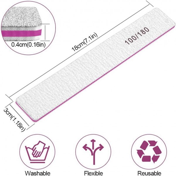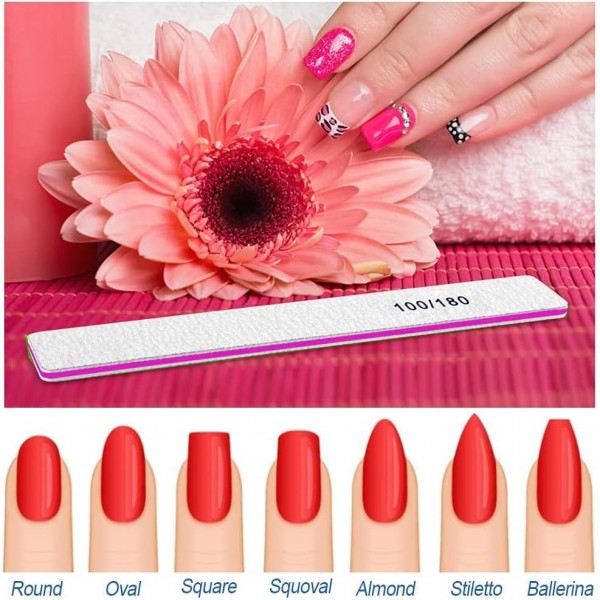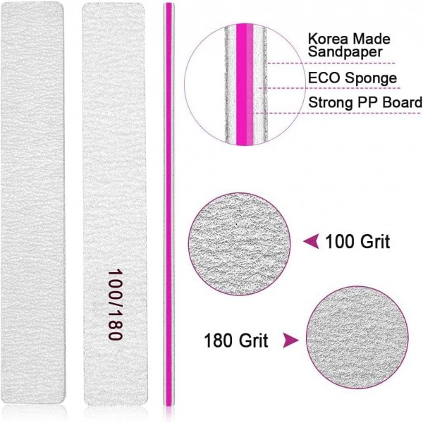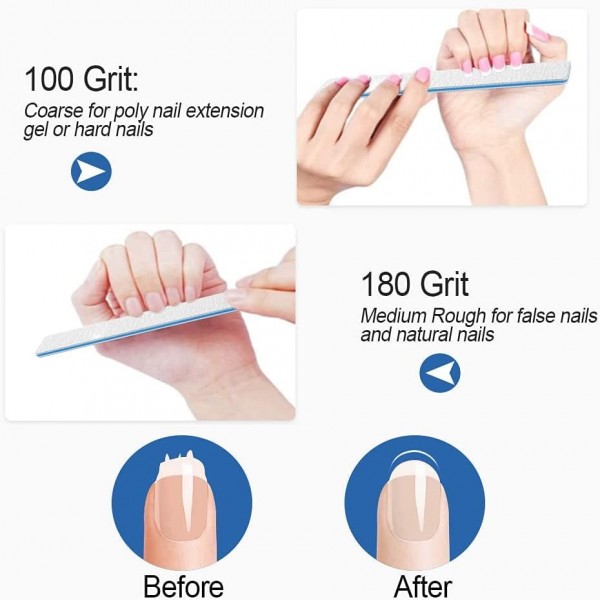 • DOUBLE-SIDED GRIT: These nail files are double sided, the two sides have different grits. One side is 100 grit, suitable for nail shaping and styling; the other side is 180 grit, used to polish the gel seal.