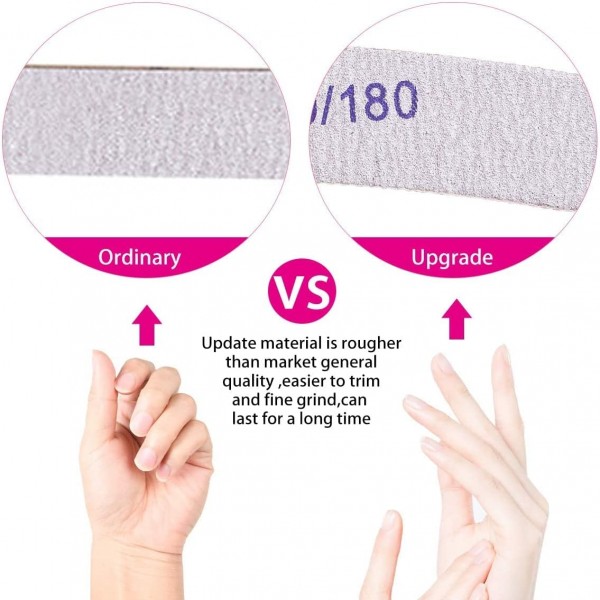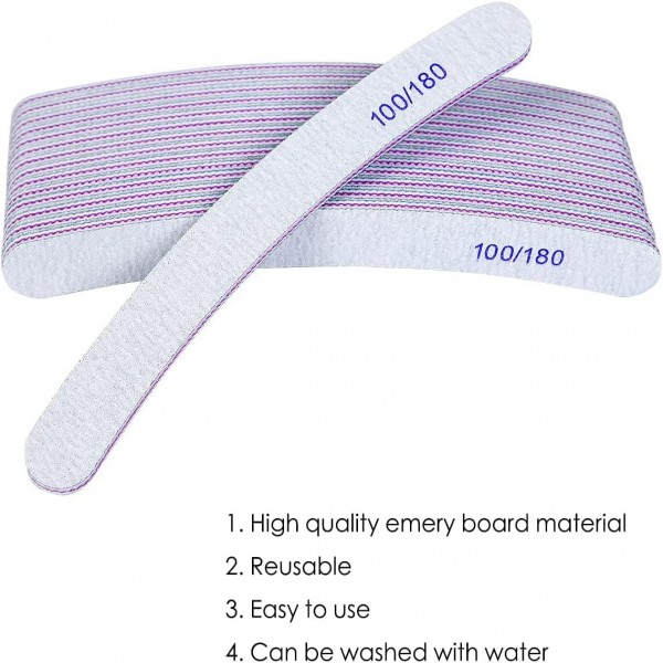 • DOUBLE-SIDED GRIT: These nail files are double sided, the two sides have different grits. One side is 100 grit, suitable for nail shaping and styling; the other side is 180 grit, used to polish the gel seal.
