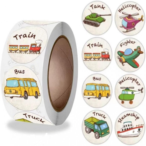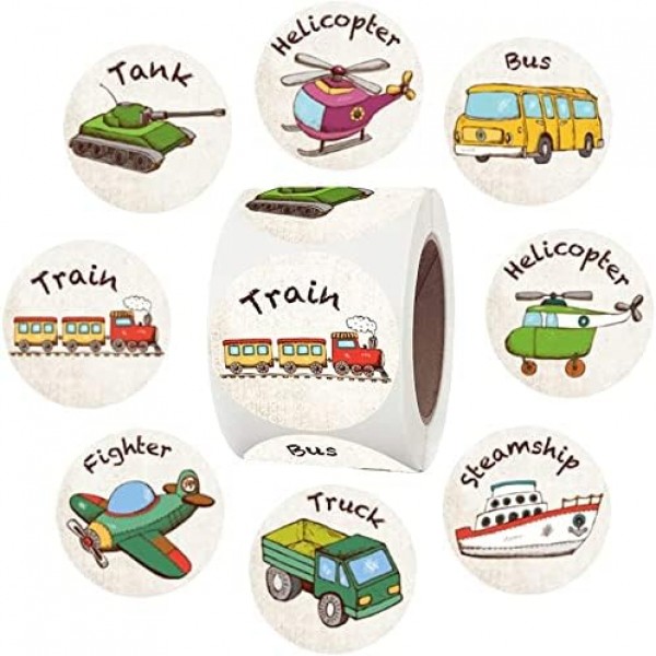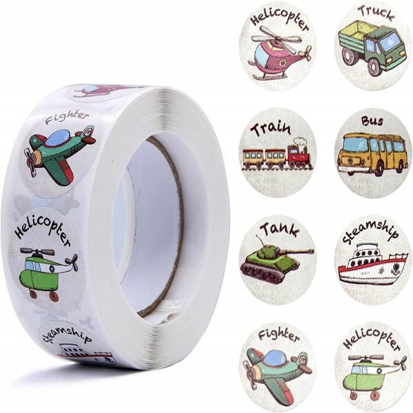 - About size details: each sticker is approx. 2.5 cm/ 1 inch in diameter, This 500 stickers Roll have 8 Designs (Bus Truck Helicopter Train Tank Airplane Steamship). you can also use it to make different gifts or crafts according to your needs, can bring different colors to your kids life