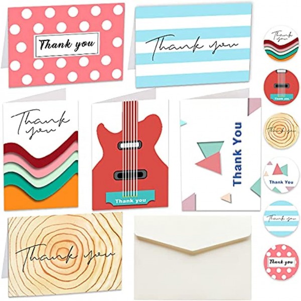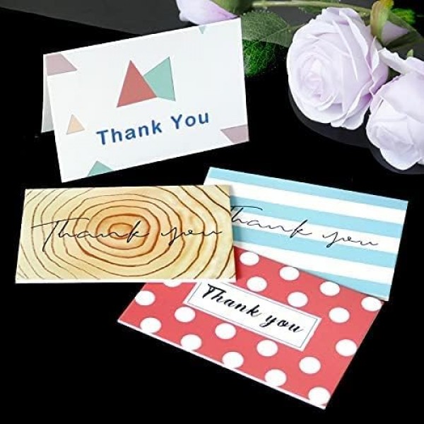 - DESIGN RANGE: 30 folded THANK YOU cards pack (Each card Design have 5pcs, 6 different designs) and 30 high quality white envelopes. Come with 30 pieces stickers make your envelope more secure. No more dealing with icky glue sticks!