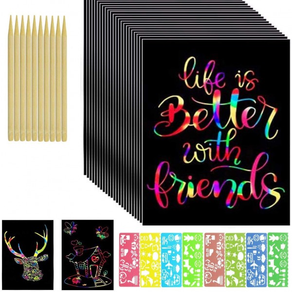 100 Large Sheets Rainbow Scratch Paper with 10 Wooden Styluses & 8 Molds Kit