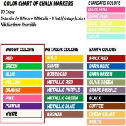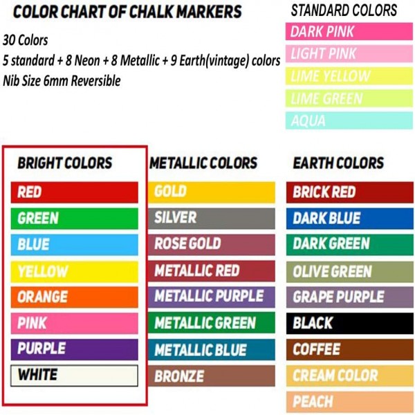 - 【ALL IN ONE 】We select the most used and popular 30 colours into this chalk pens set. Unlike other cheap water-based pens, our chalkboard pens are featured with brilliant and rich colours, smooth in lettering. We mixed all types of pens for vibrant demand of the customers. 5 Standard colors + 8 Noen Bright Colors + 8 Metallic Colors + 9 Earth or Vintage colors packed in nice zipped Cloth bag.