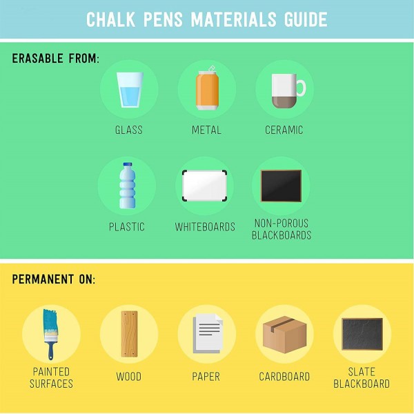 - 【Wipeable, Erasable】The chalk pens can be easily erased off from non-porous surfaces such as blackboard and chalkboard (wet erase), glass, window and mirrors (dry erase). But they are permanent on porous surfaces. Chalk markers pens are widely used for non-porous surface, for example, chalkboards, blackboards, glass, window, mirror , signs, paint paper, scrapbooking, etc.
